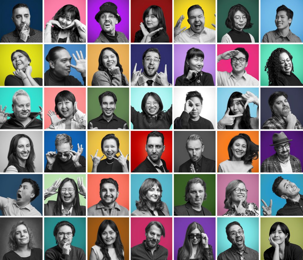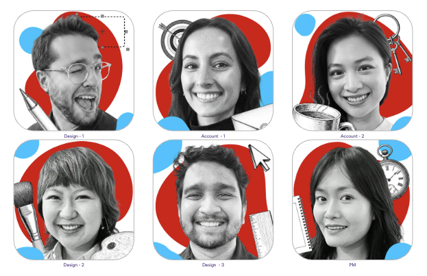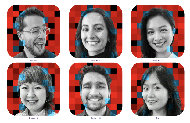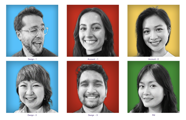 Once the collection was revealed to the team, everybody received three versions of their official PD headshot: Serious, Smiling, and Silly. The PD handle colours introduce personality and individuality, while the black-and-white portraits present a unified image.
